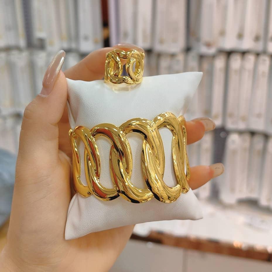 This elegant jewelry set features a wide gold bracelet with a bold wave design, paired with a matching statement ring. Made with a smooth, shiny finish, the pieces are stylish, durable, and perfect for both special occasions and everyday wear. The unique wave pattern adds a modern touch, making it a standout accessory that completes any outfit.