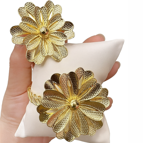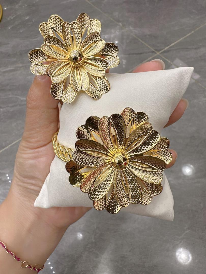 This elegant jewelry set features a bold gold flower bracelet and matching ring. Each piece is designed with layered petals that shine beautifully, giving a stylish and eye-catching look. Perfect for parties, weddings, and special occasions, this set adds a touch of class and charm to any outfit. Durable and lightweight, it’s comfortable to wear all day while making a strong fashion statement.