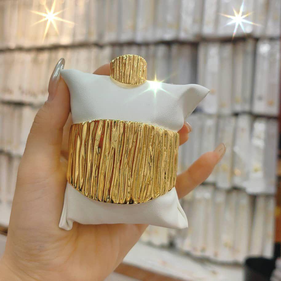 This elegant jewelry set includes a wide gold cuff bracelet and a matching ring. Both pieces feature a textured, woodgrain-like design that makes them stand out. The bracelet is bold yet stylish, perfect for adding shine to any outfit, while the matching ring completes the look. Made with a bright gold finish, this set is suitable for special occasions or everyday wear. Simple, classy, and easy to style.