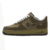 This is a low-top sneaker in olive green with suede and canvas material. It has white laces, a stitched Nike Swoosh on the side, and “AIR” written on the midsole. The inside is padded with white lining, and the sole is dark brown for durability.