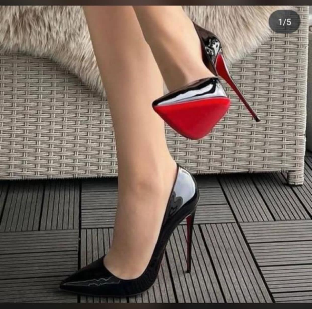 A pair of shiny black high heels with a pointed toe and very slim stiletto heel. The shoes have a glossy finish and the bottom is bright red, which makes them stand out. Stylish, elegant, and perfect for parties, dinners, or any special occasion.