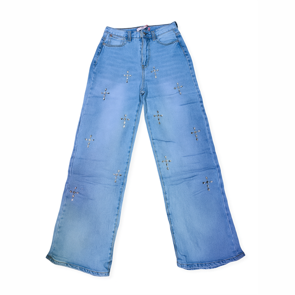 Step out in style with these light blue wide-leg jeans decorated with sparkling crystal designs. Made from quality denim, they feature a relaxed fit for comfort and a trendy look. Perfect for casual outings, these jeans add a touch of shine to your everyday wear.